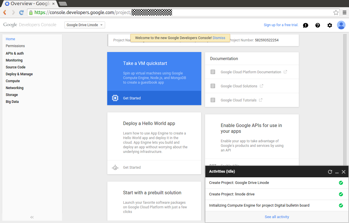 Google will take a moment to create the project, and when it’s complete you’ll arrive at the dashboard: