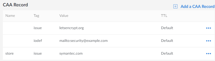 Multiple CAA records must be added individually. If your site example.com was issued a TLS certificate by Let’s Encrypt, but your subdomain store.example.com uses a Symantec certificate, you would need two different CAA records. A reporting URL for the iodef tag would also need its own record. Those three would look something like this: