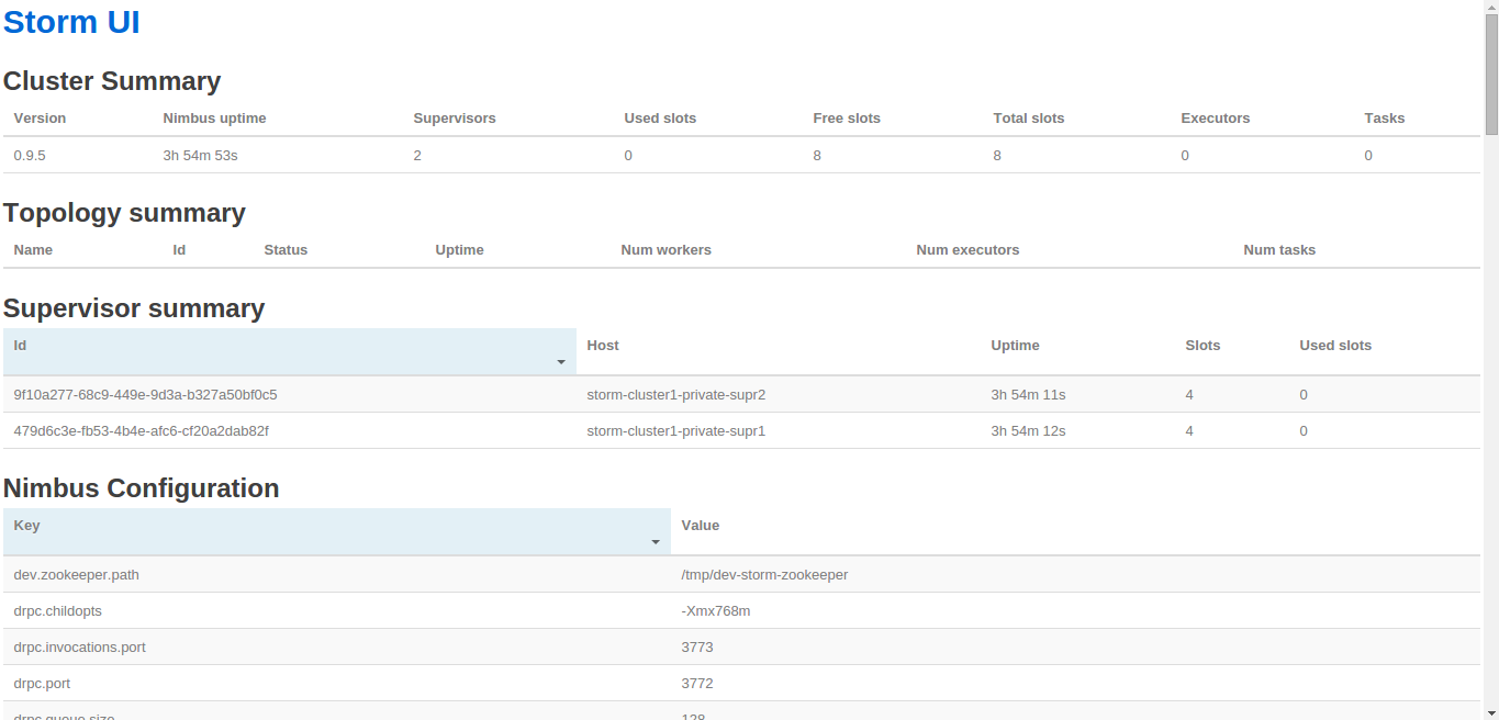 http://public-IP-of-client-nodein a web browser on each whitelisted workstation. You should see the Storm UI web application, which looks like this:The Storm UI displays the list of topologies and the list of supervisors executing them:
