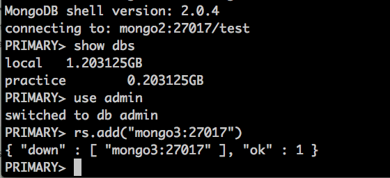 rs1:PRIMARY> rs.add("mongo2:27017")