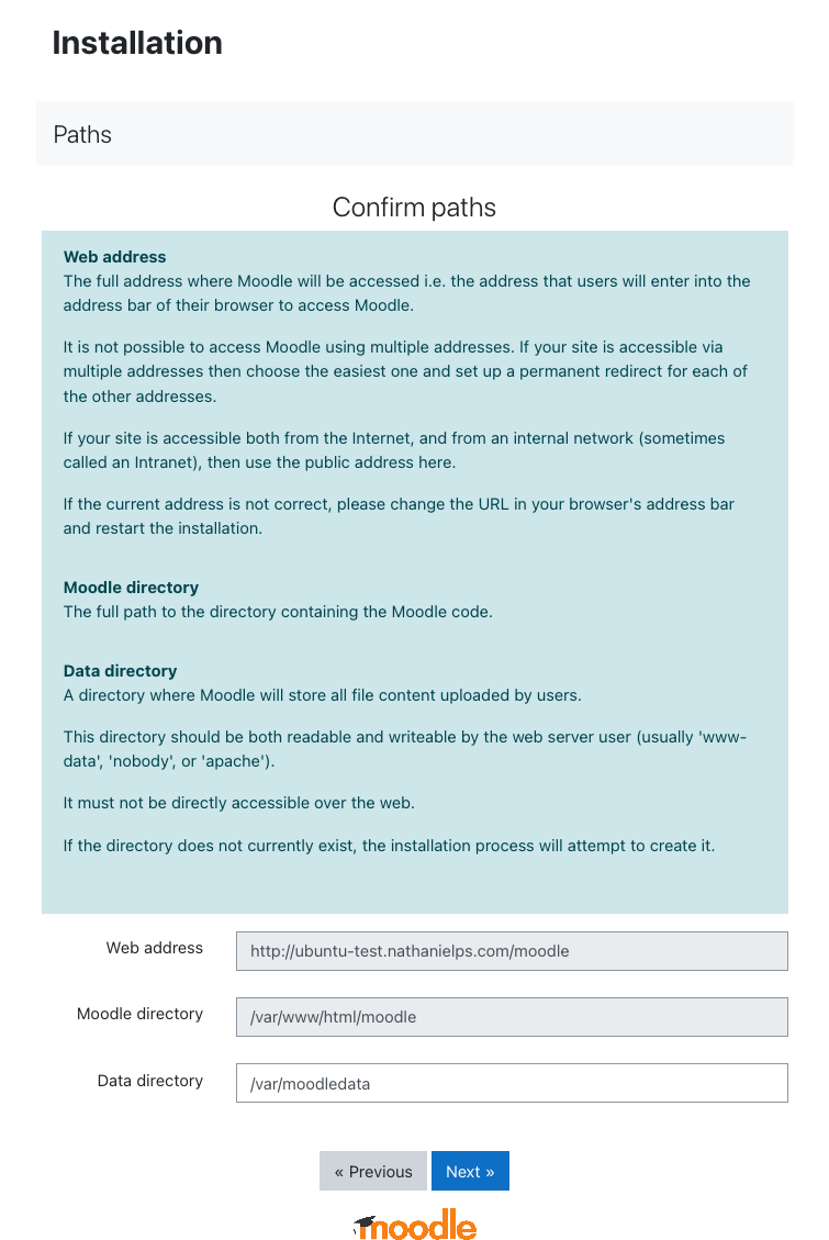 /moodle. So, if your server’s domain name isexample.com, then the Moodle URL would beexample.com/moodle.Follow the prompts to complete the Moodle setup. Enter the default options or your preferences for all settings except the following: