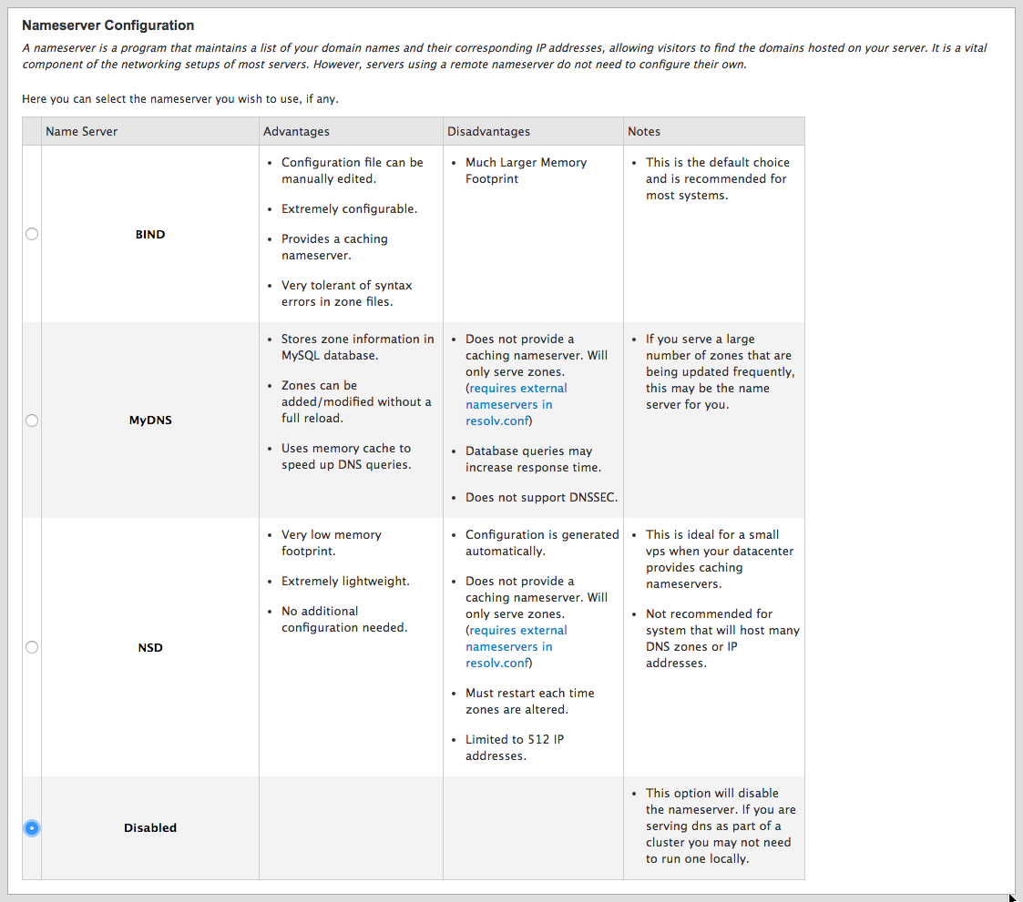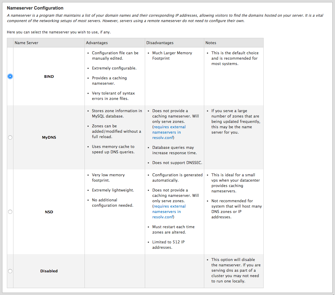 If you wish to operate your own DNS servers on your Linode, select either BIND or NSD under the Name Server column. You must list the nameservers you set up in the “DNS Prerequisites” section of this document. Consult Linode’s guide on setting up your own nameservers in WHM using a single IP address, available in our Set up DNS Services on cPanel guide.