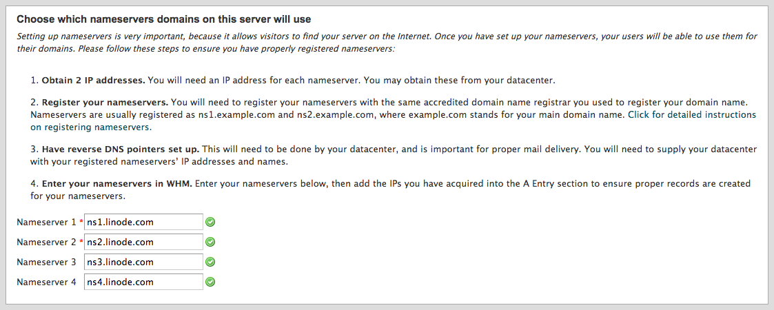 Should you wish to provide DNS services, you’ll need to add A records for your nameservers in your WHM as described in the DNS on cPanel guide.