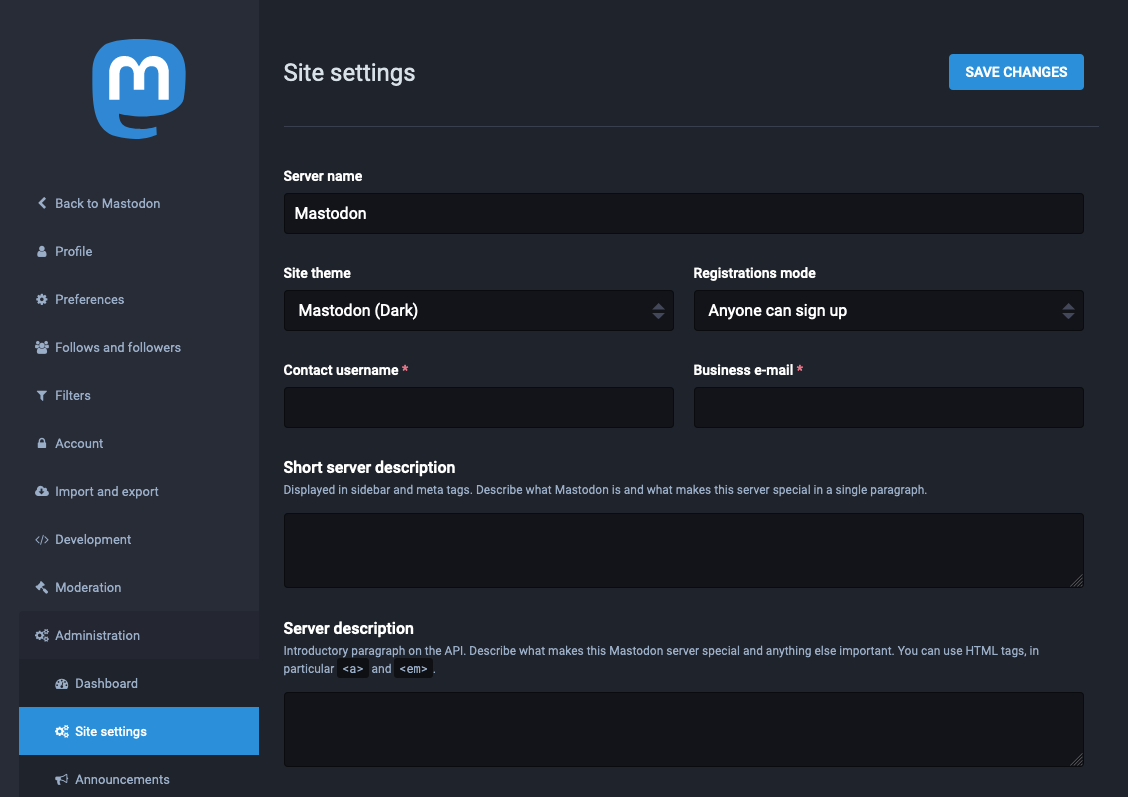 VAPID_PRIVATE_KEYandVAPID_PUBLIC_KEYusing the following command, and copy the output, and paste in theVAPID_PRIVATE_KEYandVAPID_PUBLIC_KEYlines in the.env.productionfile.docker-compose run --rm web bundle exec rake mastodon:webpush:generate_vapid_keyFill out the remainder of the