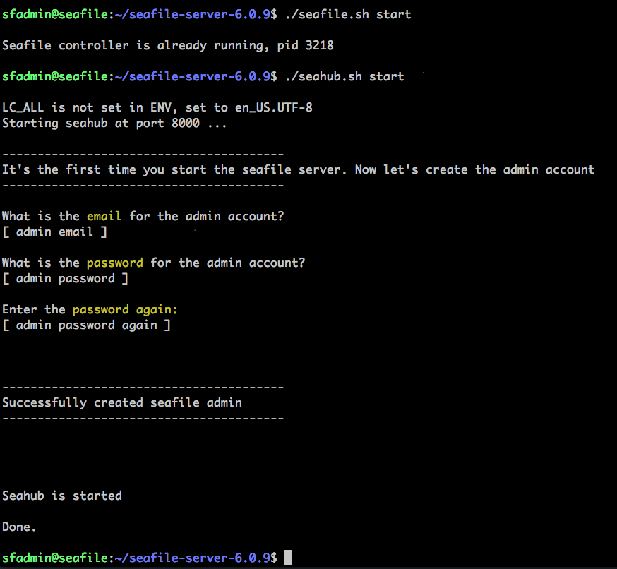 seahub.shscript will set up an admin user account used to log into Seafile. You’ll be asked for a login email and to create a password.Seafile should now be accessible from a web browser using both your Linode’s IP address or the