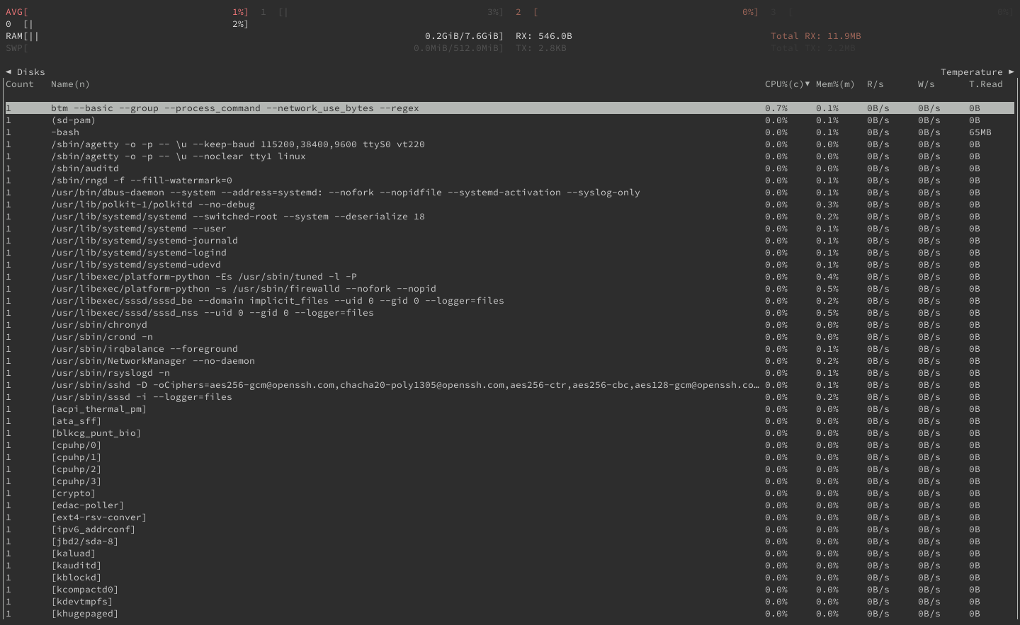 btm --basic --group --process_command --network_use_bytes --regex