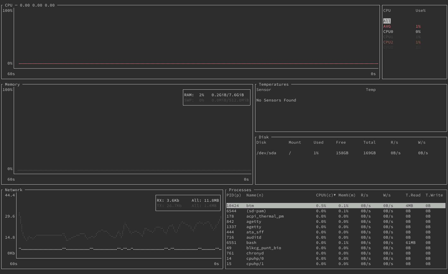 Bottom is a graphical system monitoring dashboard for the terminal. What sets it apart from similar tools is the high degree of customization options and features it offers. Whether you want to get a quick graphical summary of your system or dive through its running processes, bottom is a great tool to use.