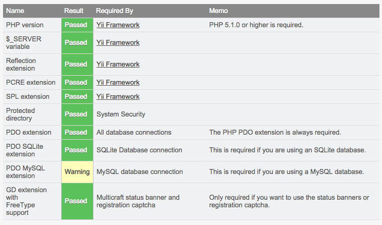 http://12.34.56.78/multicraft/install.php, replacing12.34.56.78with your Linode’s IP address or domain name. Click onStart Installation:Multicraft will check your requirements. If you completed the steps above without issue, your page should reflect the results shown below: