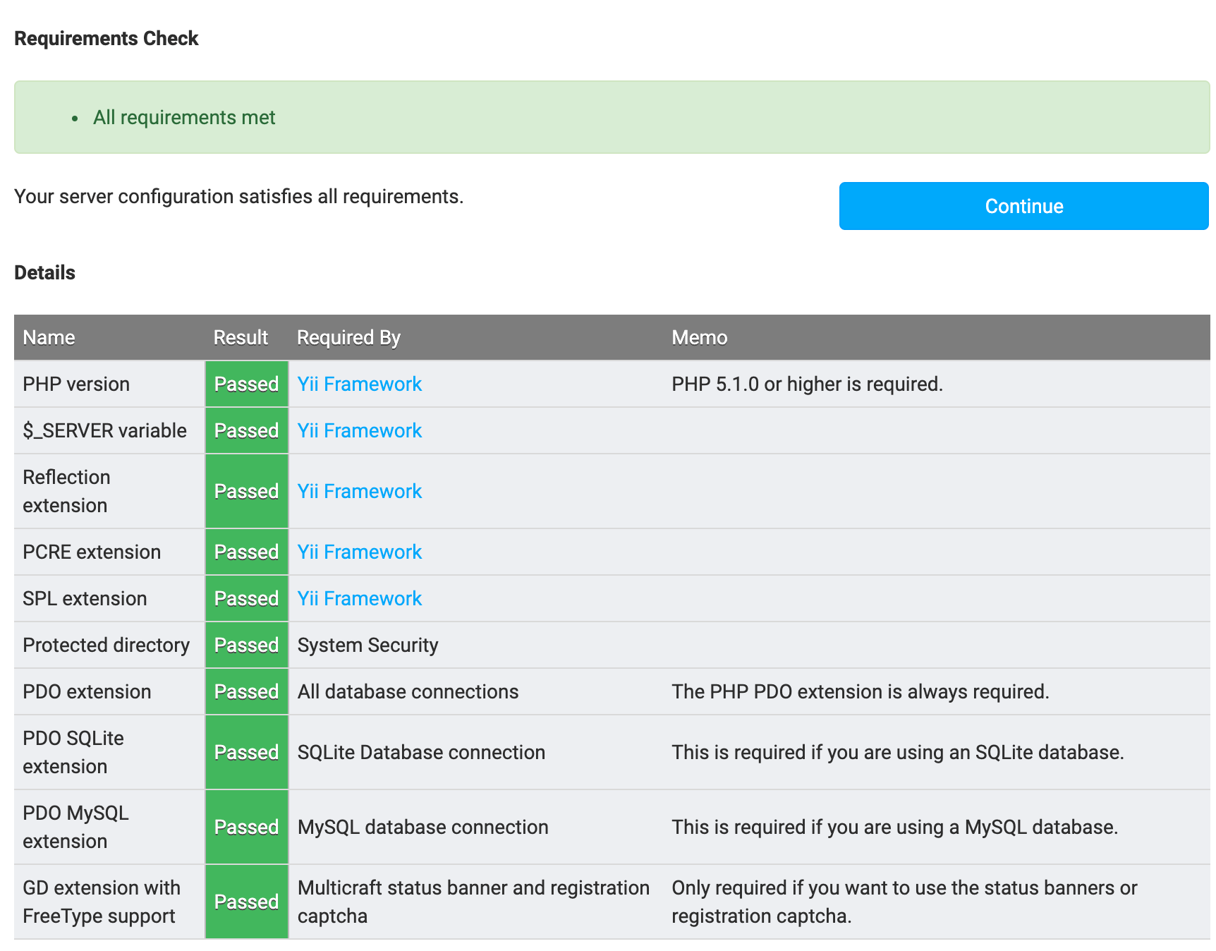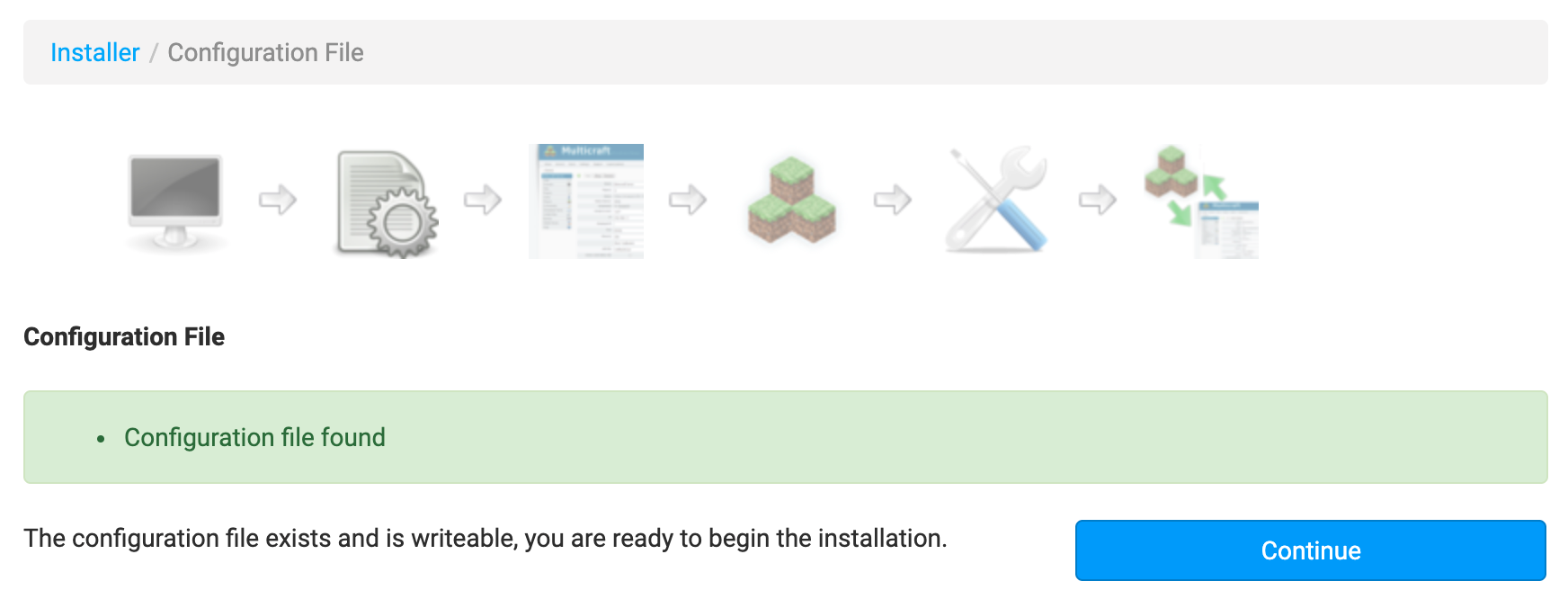 config.phpfile and if it is writeable. If successful, clickContinue:On the next page, click