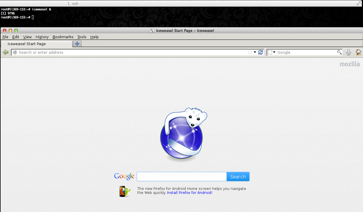 3. Now, let’s try something a bit bigger. Iceweasel is the name given to Debian’s version of Mozilla’s Firefox browser. The following commands will install and launch Iceweasel from your Linode: