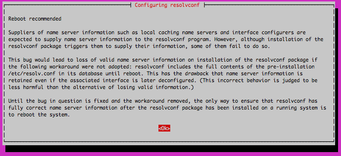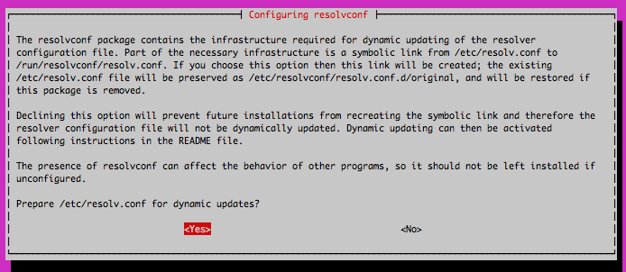 If you are using Debian 7, replace this command withapt-get install dnsmasq resolvconfand skip steps 7 through 9You will be presented with a series of options in an ncurses menu. First, choose yes to prepare