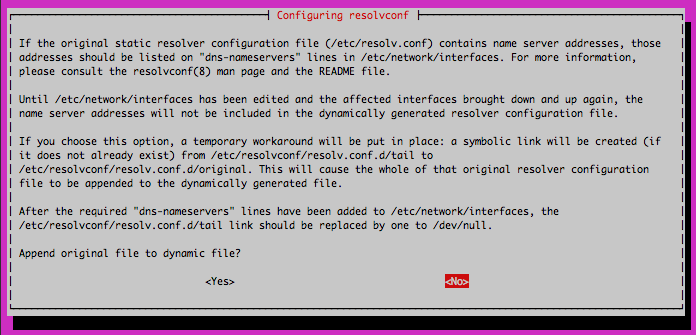 /etc/resolv.conffor dynamic updates.At the next option select No. This means that you will need to update