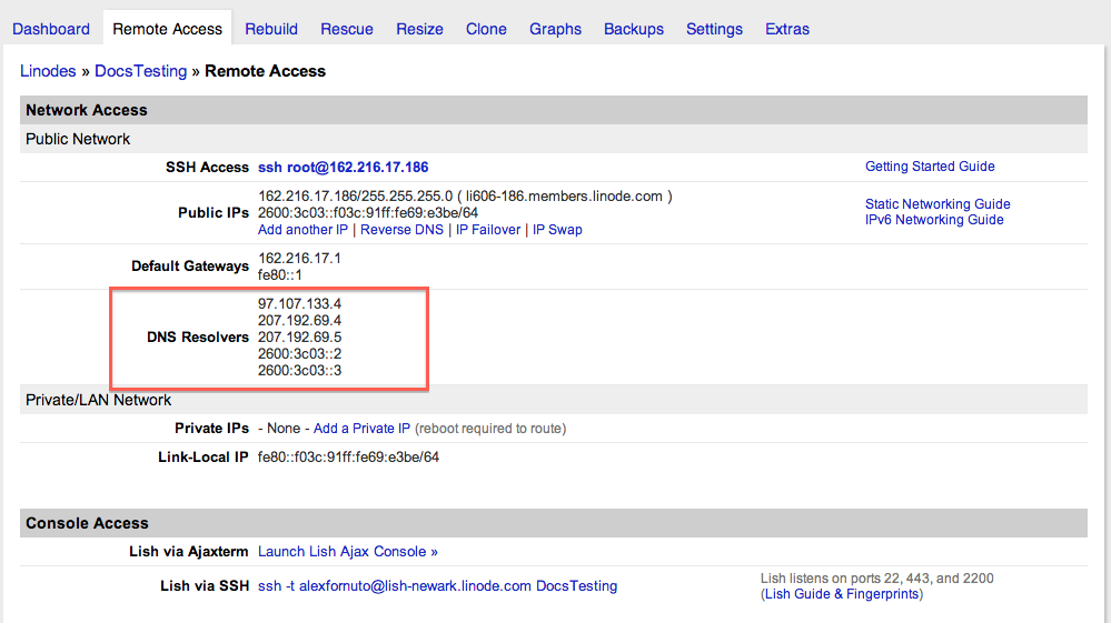 Now that dnsmasq is configured, you will need to add two new lines to /etc/network/interfaces. First, go to the Linode’s Networking tab, shown below. You’ll need the IP addresses listed under DNS Resolvers for the
