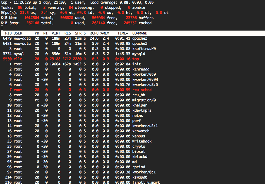 top - 15:21:04 up 2 days, 1:14, 1 user, load average: 0.00, 0.01, 0.05