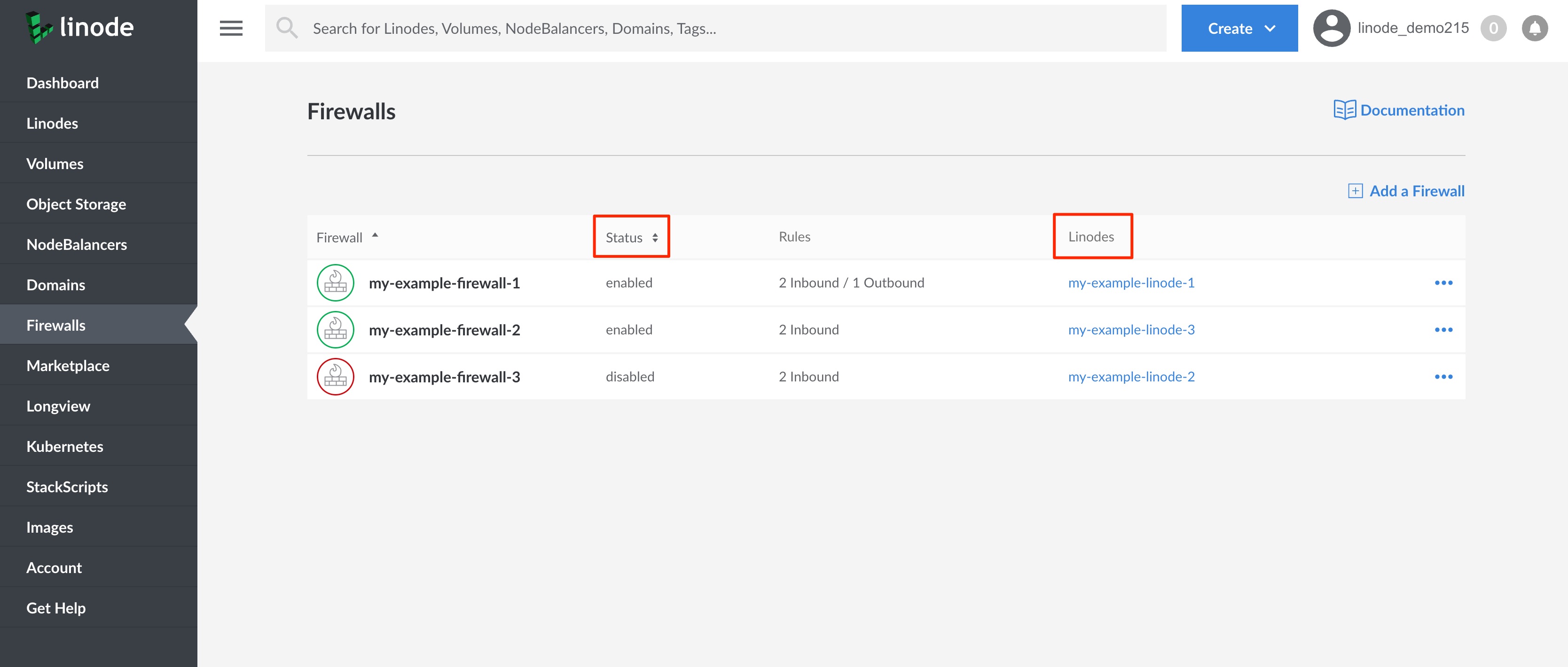 3. Find the Linode you are troubleshooting under the Linodes column to determine which Cloud Firewall(s) is assigned to it.