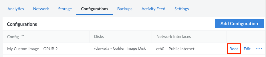 Reboot the Compute Instance using the new Image. Navigate to the Configuration tab, find the new configuration profile in the list, and click the corresponding Boot link. This link may be displayed with the More Options ellipsis dropdown menu.